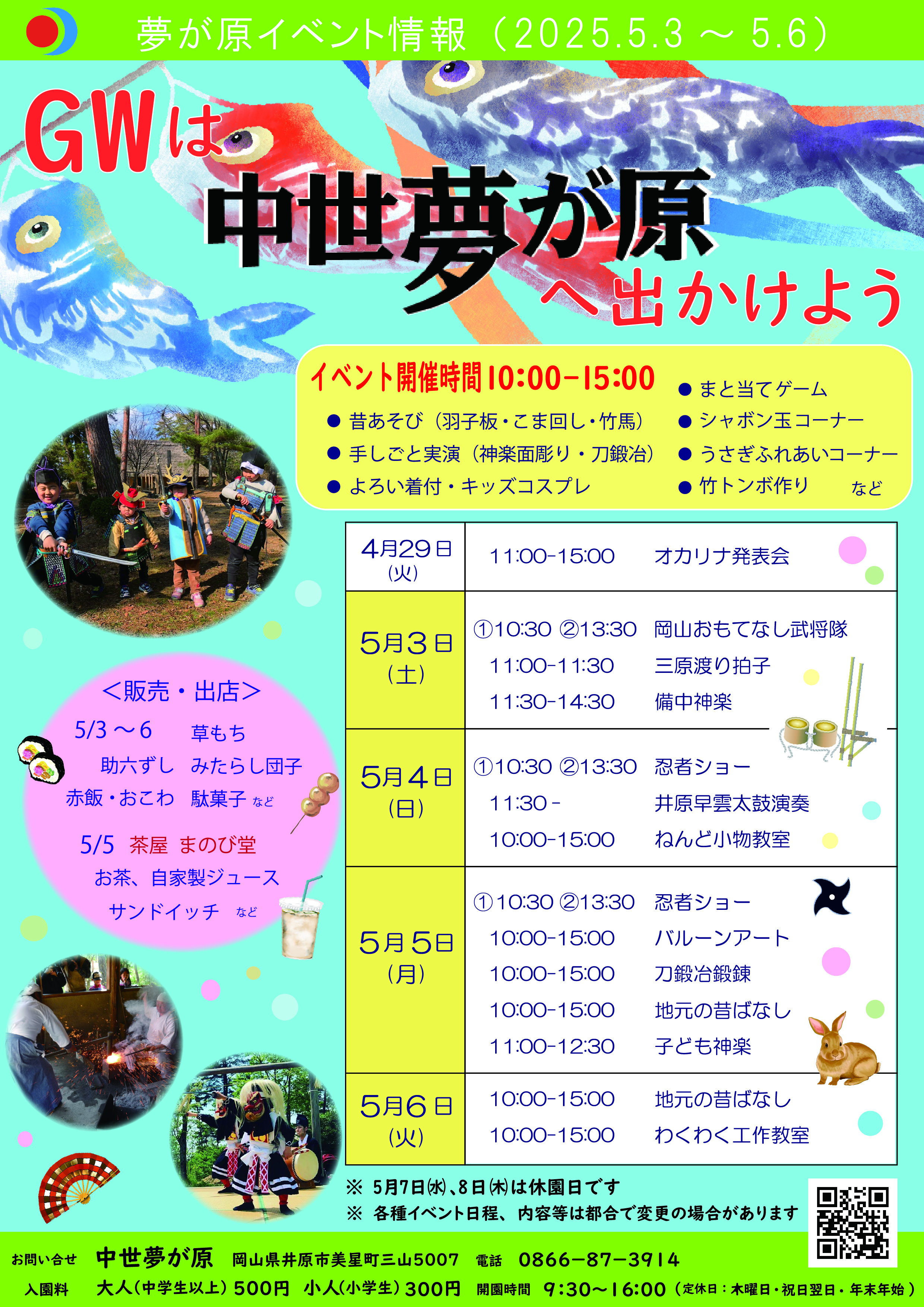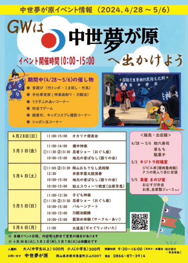 さて、今年も5月の連休は神楽や忍者ショーの他にもにぎやかに楽しんでいただける企画をご用意いたしました。