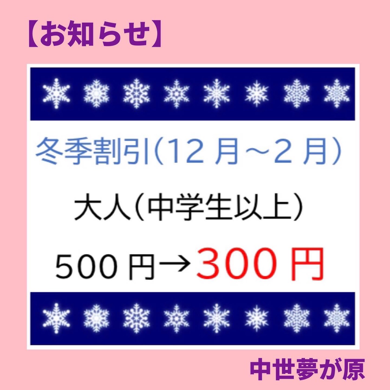 12月から2月までは小学生以上300円です