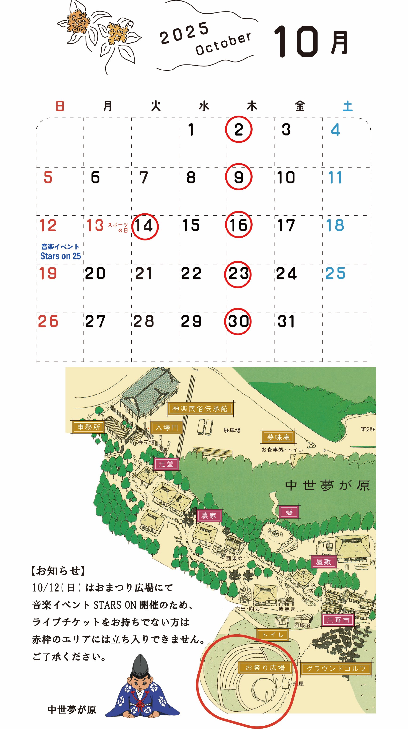 ●10/12(日)はおまつり広場にて音楽イベントSTARS ON開催のため、ライブチケットをお持ちでない方は赤色エリアに立ち入りできません。ご了承ください。