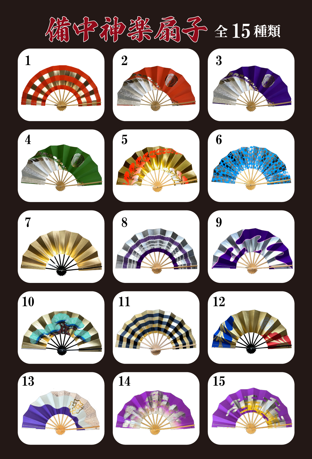 中世夢が原では受付にて備中神楽扇子を販売しています。現在15種のデザインを販売中!