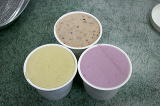 お子様からお年寄まで、人気の商品です。(写真の中央が紫焼き芋ジェラートです。右がウコン、左が栗です。)原料の紫芋の品種は、パープルスイートロードで、塩飽農園の畑で手間隙かけて育てた紫芋です。この紫芋を焼き芋にして、その後、ペースト状につぶした紫芋を利用してジェラートに仕上げています。季節限定品です。 売り切れました。秋までお待ち下さい。 |