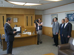 | 前原会長・森幹事・藤井青少年健全育成委員長は井原市役所市長室において、魚津児童 交流事業助成金を瀧本井原市長に贈呈した。 |