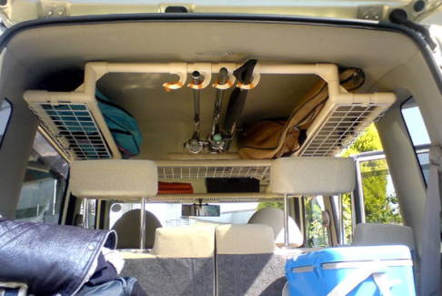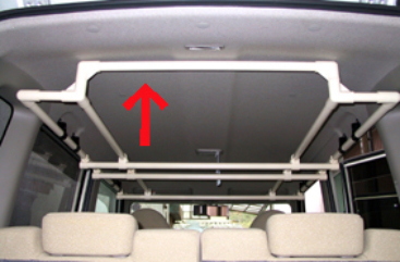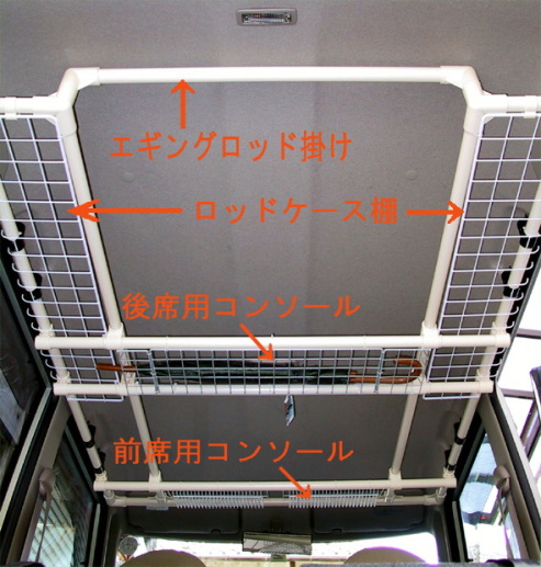 | 最後に一番後ろからパイプを組み付けて骨組みの完成です。 ここですべてのジョイント部を接着剤で固定しました。 イレクターシリーズの接着剤は、スポイドで流し込むタイプなので 今回のように天井付近の部品には、かなり苦労します。 シートにこぼれないように、手で雫を受けたこともありました。 今回の設計の特徴は、最後尾の段上げ部分(矢印部分)。 釣り以外での収納性と共に、バックミラーでの後方確認性にも 寄与しています。 しかし本当の狙いは、今年中にエギングデビューを目論んでいる 管理人は、この位置にフックを増設して、エギングロッドの 収納を企んでおります。 今回の改造に至ったすべての元凶は 友人に貰ったカーメイト製のロッドホルダーに 「タントには取り付けないで下さい」と言う注意書きがあったから。 付けれないと言われると付けたくなる天邪鬼ですみません。 |