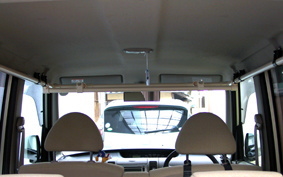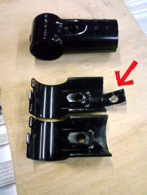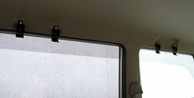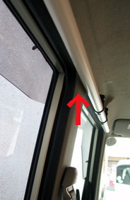 | 前に書いた「金具の曲げ」について説明します。 アシストグリップを取り外した壁面は、少し傾いています。 そのままの位置にHJ-1を取り付けますと センターピラーに干渉して(矢印位置)、うまく取り付きません。 その対策として、金具の取り付け部を少し曲げて パイプ位置を少し車内側に移動させる必要があります。 もし曲げるのが困難であれば、ベースのパイプを2分割して センターピラー部を避ける方法もあるかと思いますが 管理人としては何とも言えません。 |