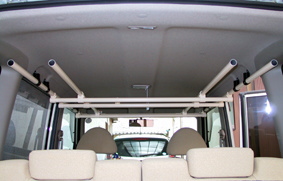 | 車の片側に4箇所金具を取り付けます。 強度的には2箇所でも行けそうですが、穴が見えるのが みっともないので、全部の穴に取り付けました。 この時点では本締めしないで下さい。 この後、ベースとなるパイプ位置の確認がありますので 微調整出来るように少し緩めておくのがコツです。 |