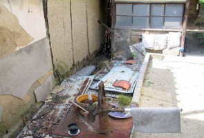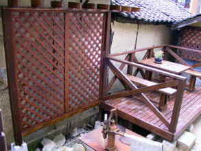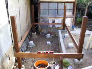 | 施工予定地です。 写真の右側が母屋になります。 今回は家から直接出入りできるタイプではなく 独立した形で作る事にしました。 ご覧のように段差のある所に作りますので 「根太置き式」ではなく「柱建て式」とします。 大きさは、柱の外寸で2900×1800程度になりそうです。 |