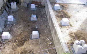 | 8月10日 基礎工事を行いました。 ここで出切る限り水平を取っておかないと 後々の作業がめんどくさくなると思い 水準器を使いながら一つ一つ位置決めをしていきました。 写真の左半分と、右では約70cmの段差があるため それぞれの水平と位置に若干手間取りました。 |