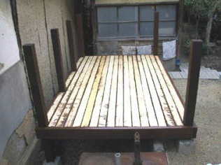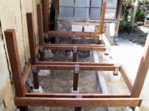 | 9月8日 根太と束柱を組み立てました。 固定には「シンプソン金具」を使用しました。 この写真だと、土地の高低差が良くわかると思います。 束石の水平を出しておいたおかげで 思ったよりはスムーズに進みました。 この後は、隠れてしまう部分の2回目の防腐剤塗布と モルタルによる柱の固定です。 |