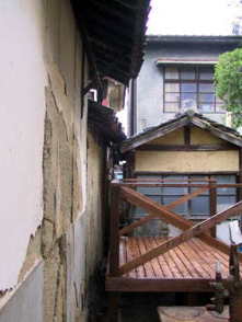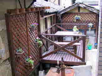 | ここで新たなる問題が発生しました。 管理人が住んでいる所は田舎なので、 隣家との境もハッキリしていません。 そのため写真にあるように 樋の無い屋根がデッキの上まで あることがわかりました。 このままでは、局部的に雨だれが落ちるために 木が痛む事は明白です。 この後急遽、雨対策を考えることになりました。 |