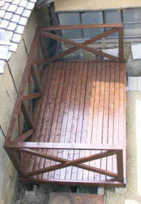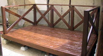 9月1日 手すり柱と幕板を組み立てました。 ここでも注意するのは水平と垂直。 一人での作業ですので、クランプが大変重宝でした。 当然ながら木材には一回目の防腐剤が塗布されています。 寸法的には2855×1755になりました。 柱と束石の隙間には、防水を兼ねて セメントを注入しております。 |