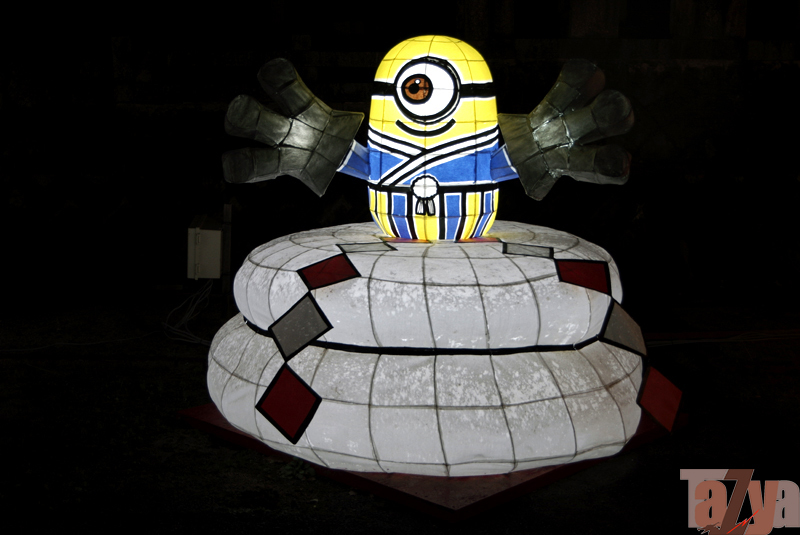 夏のパレードは7月豪雨の影響で中止となりました。 元気を取り戻すためにも、冬のイルミネーションは輝いています。 入り口周辺です。この辺りに無料駐車場が完備されています。 絵ぶたという名前から想像は付くでしょうが、基本形は「ねぶた」でしょう。 骨組みと和紙で型取って、着色していく工法です。 いかがです?見事な物でしょう。 それでは舞台装置的出し物と、キャラクター単体部門で。 舞台装置部門より6景! いかがでしょう? 結構な完成度ではないですか?? |