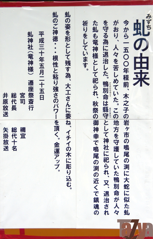 ではスタートです。神社の目前には池のある公園があり 石造りの橋が架かっています。結構良い雰囲気です。 橋を渡って鳥居の前へ。以前ご紹介しましたが鳥居には「龍であり虬」が。 鳥居をくぐると見上げるのは石段。約130段ありますので体力と相談を。 境内に入る前には特徴的なしめ縄も。 境内の全景になります。 駐車場からはこの見た目で、石段を上がると写真右手から到着です。 女性のおられるところが社務所で御朱印をいただけます。 この日も平日のお昼前だったのですが近畿ナンバーの車が。 管理人は御朱印収集はしておりませんので、お参りを済ませた後に境内を散策です。 拝殿から右手に目をやると厳島神社。 更に厳島神社左手には水分神社も。 グルっと回って拝殿左側には八幡神社です。 ここには「虬」の由来が。 更に左並びに素戔鳴神社・崇道神社。 天満神社・琴平宮と並びます。 さあ本殿へ向かおうと思ったとたんに、突然の雨!! 最近は神様に歓迎されっぱなしです(と思った方が良いことが)。 もちろん猪目も見つけました。 雨でからかわれたかと思えば、こんなシャッターチャンスもいただけます。 この鳥はホバリングできます。 |