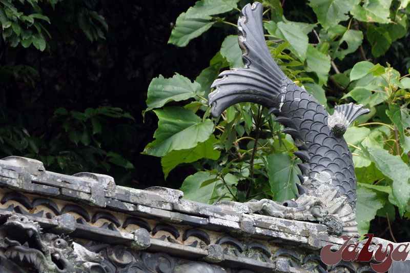 大まかな位置は、鴨方町にある素麺屋さんの水車小屋から 真北に500m位になります。「里庄地頭上線」を越えたあたりです。 行きたいと思った理由は「瓦の化粧飾り」が見事だという評判を聞いて。 民家の横にバイクを停めさせていただいて、小道を登ります。 道案内はちゃんと出ていますが、坂は結構きついです。 距離的には200m弱でしょうが、最低でもスニーカーで。 5分くらいで神社前に到着です。 さてさて、案内看板にあるように浦島太郎とか金太郎がいるようなのですが 管理人的に「コレ」と断定できるほどの自信がありません。 ということで、写真紹介だけで後はご想像にお任せいたします。 下の方に見える茶色い生物は『スズメバチ』 です。 このすぐ下側に結構大き目の巣を作っていました。 以上、瓦編でした。 |
