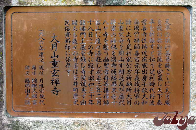 まずは道のりですが、現在の重玄寺前を天神山池方面に登ります。 下の地図で矢印方向から登って来ることになります。 ![]() ここで注意です。管理人も訪問の目的は「重玄寺跡ではなく雪舟の墓」でした。 上の地図にも「重玄寺跡」と注釈を入れましたが、実際は「雪舟の墓」になります。 道案内も「重玄寺跡」までの距離で表示してありますので 「雪舟の墓」を訪れたい方は、この看板に200m加えてお考え下さい。 では今回は詳しくご紹介しましょう。天神山池を過ぎて「A地点」の三叉路です。 右手の「和田」方向に右折してください。 道なりに行けば「B地点」に着きます。 目印はヘアピンカーブに立っている2本のカーブミラーです。 この中間部分に右折出来る細い道がありますが、車両進入可能です。 看板は「重玄寺跡まで300m (雪舟の墓までは500m以上)」とあります。 道は荒れ気味ですが、余程の高級車でなければ大丈夫。 ほどなく「C地点」に到着。ここも間違える危険はなさそうです。 看板は「重玄寺跡まで100m (雪舟の墓までは300m以上)」とあり ここから歩こうかなと思ったのですが、『雪舟の墓に行く方は車一択で』 まだかな、まだかな?と思っていると、やっと雪舟の墓所に到着。 看板にある「重玄寺跡」は、入口が発見できませんでした。 イメージは先に駐車場があり、その奥に目的地があるパターンが多いのですが ここは雪舟の墓を通り過ぎた奥側に、立派な駐車場がありました。 途中は不安になりますが、ちゃんと方向転換できる駐車場がありますので 余程の大型車でなければ、遠慮なく車両で進入してください。 |