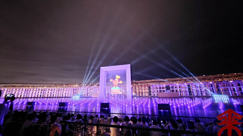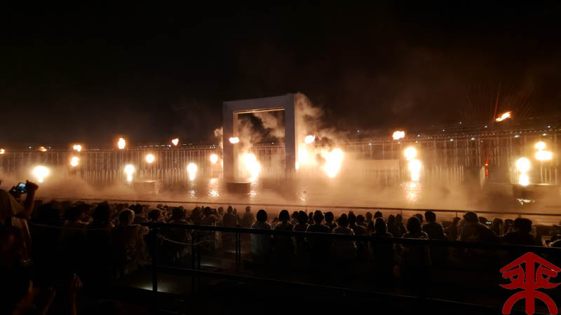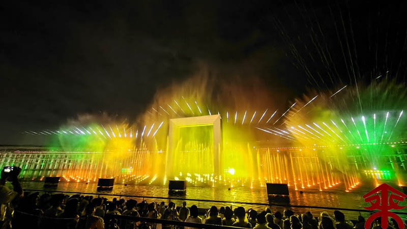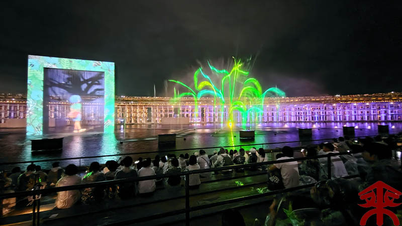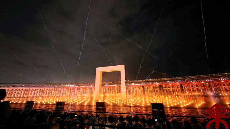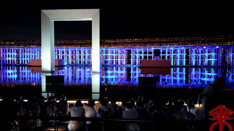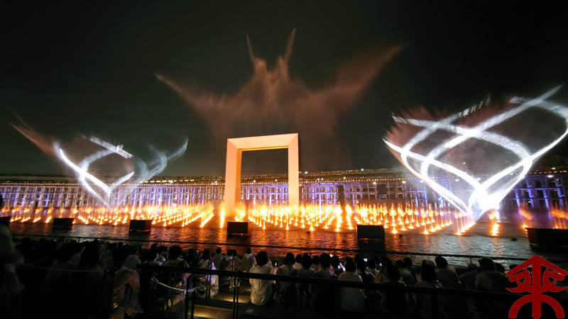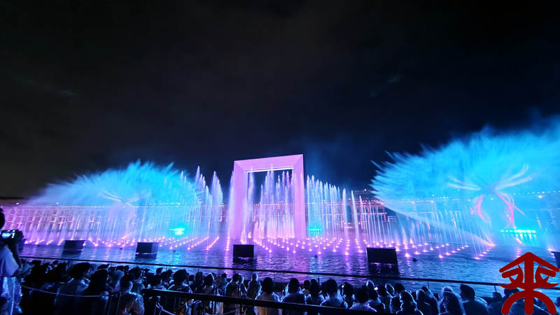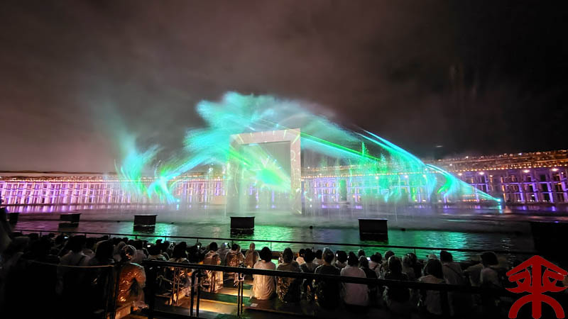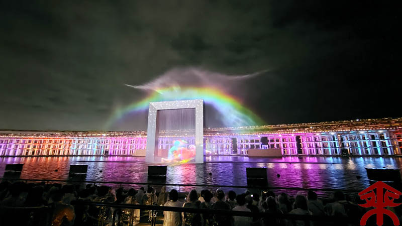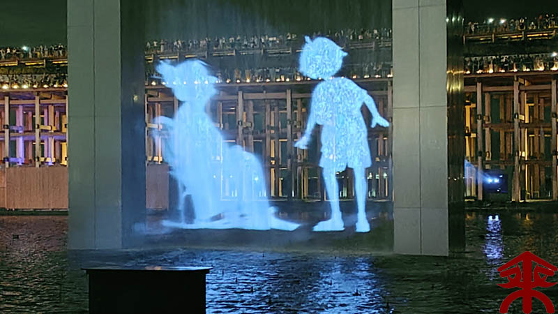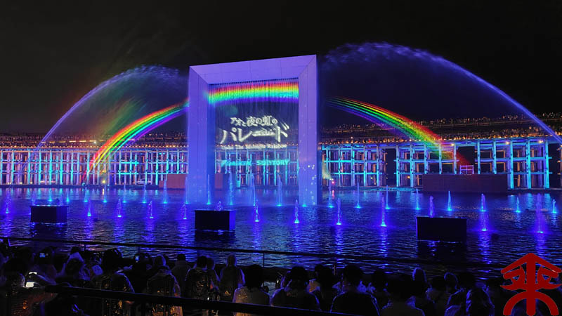 予約したイベントは、ウォータープラザで開催される 『アオと夜の虹のパレード』 水煙に映すプロジェクションマッピングというイメージでしょうか。 まずは会場を。 こんな感じで投影されます。 それでは色々な場面を。案外にうまく撮影できました。 最後は題名通りに「夜の虹」で。 メッチャ良かったです。 |