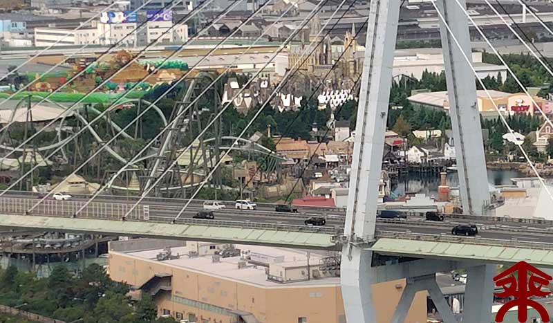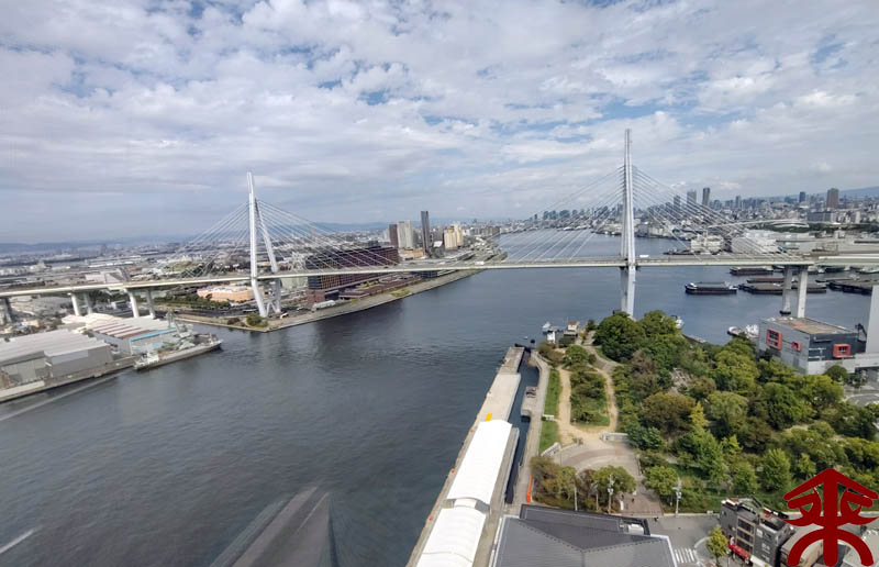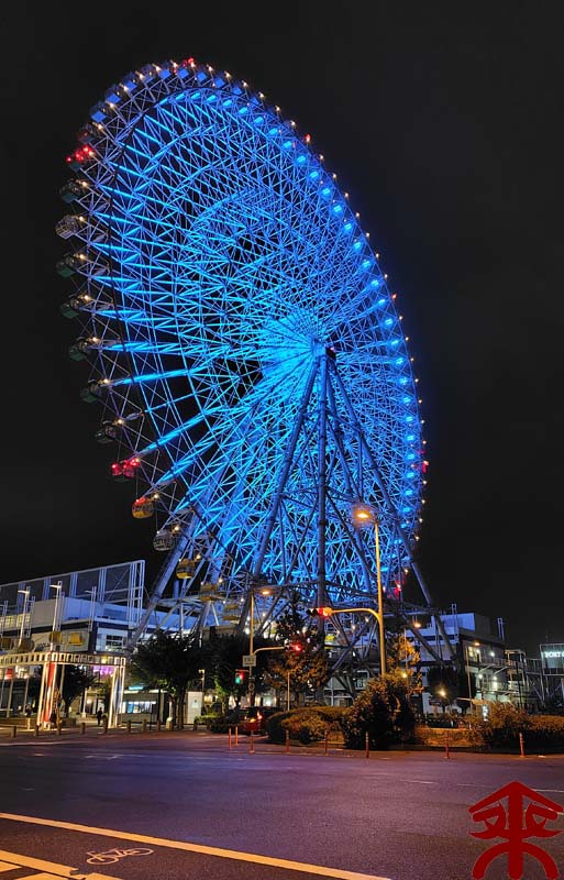 ほぼ頂上からの風景でスタート。日本で3番目の大きさらしいですね。 USJも見えます。 通常ゴンドラは待ち時間もわずかですが、シースルーゴンドラは30分待ちでした。 管理人は通常ゴンドラへ。1人900円です。 このあと万博に行きましたので、次は夜のイルミネーション。 動画であれば奇麗なのでしょうが、静止画ではイマイチでした。 近すぎるの減点ポイントでした。案外に模様が分かり難いです。 |