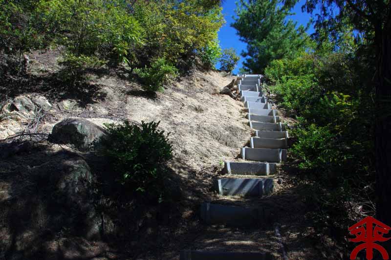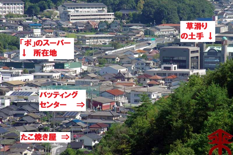 ではスタートです。最初は井原鉄道・出部駅から。 そこから南方向に200mほど歩くと、サボタージュ・サマーで雑草を集めに行った 『刈山公園」に到着します。まだ出部駅が目視できる距離です。 その横手に山に登る道が続いています。 ただし最初はコンクリートの奇麗な道ですが、途中からは未舗装の山道になりますので 最低でもスニーカー程度の靴で挑戦してください。 距離はそうでもないですが、ちょっと後悔するような急坂を登ると 分岐点に出ます。右方向は既知の「岩屋観音院」へ。 左は今回の目的地の「戸木荒神山城跡」になります。 最後にこの階段が見えたら到着です。 頂上部分にはソコソコの広場と展望台が設置されています。 訪問は9月でしたが、冬の方が見晴らしは良いでしょうね。 では風景を少しだけ。まずは町の中心部で市役所辺り。 サボタージュ・サマーの聖地をいくつか。 右の山の後ろ側に、写生で行った神社とか焼肉屋やコンビニがあります。 ラジオ体操の神社も手に取るように。 |