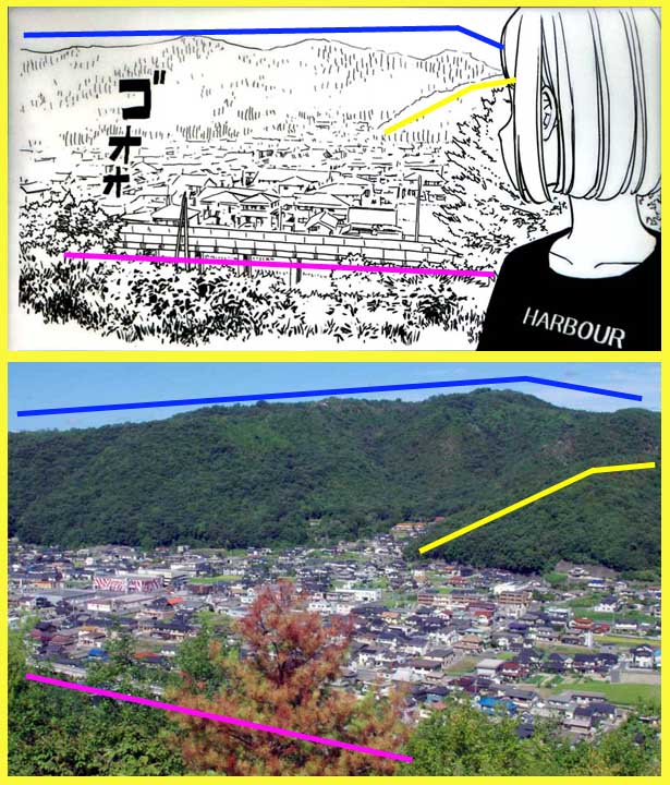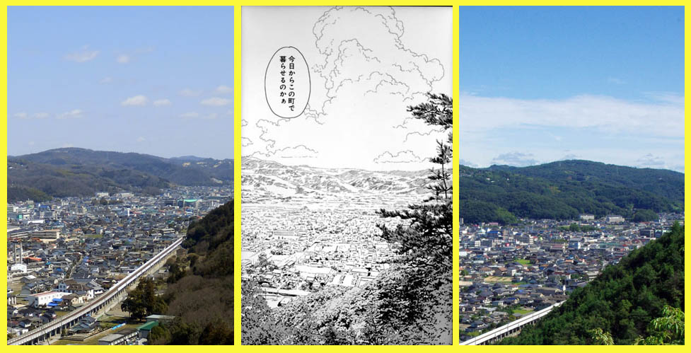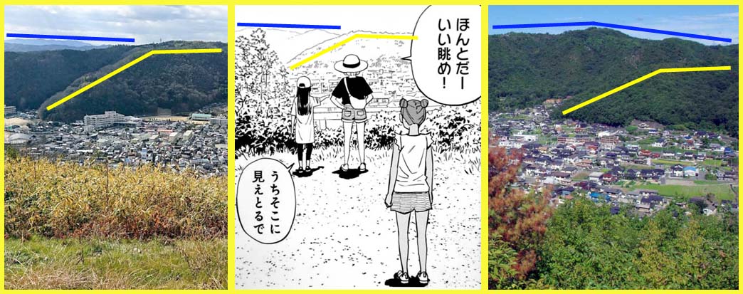 さて、管理人は今でも紙の新聞を取っていますが 「誤報に関する検証」という記事が掲載されていました。 以前の「聖地紹介」で、管理人の解釈とは違う指摘がありましたので 今回はその検証がメインテーマになります。 まずはミナトが井部の町に到着した鳥観図。 管理人的には『街の広がり』と『背景の山の大きさ』で 右写真の「戸木荒神山城跡」ではなく、左側の「岩屋観音院』と判断しました。 岩屋観音院 作中の風景 戸木荒神山城跡 ![]() 次に秘密基地の場所。 立っている広場的には戸木荒神山城跡が近いのですが お向かいの山の風景的に、後の山の高さを考えると「北山フライトエリア」の方が 似ていると判断しました。 北山フライトエリア 作中の風景 戸木荒神山城跡 ![]() しかし、このカットを見ると「戸木荒神山城跡」そのものなんですよね。 ![]() 真実は作者様に聞かないと分かりませんが どうやら『戸木荒神山城跡』に分がありそうです。 |