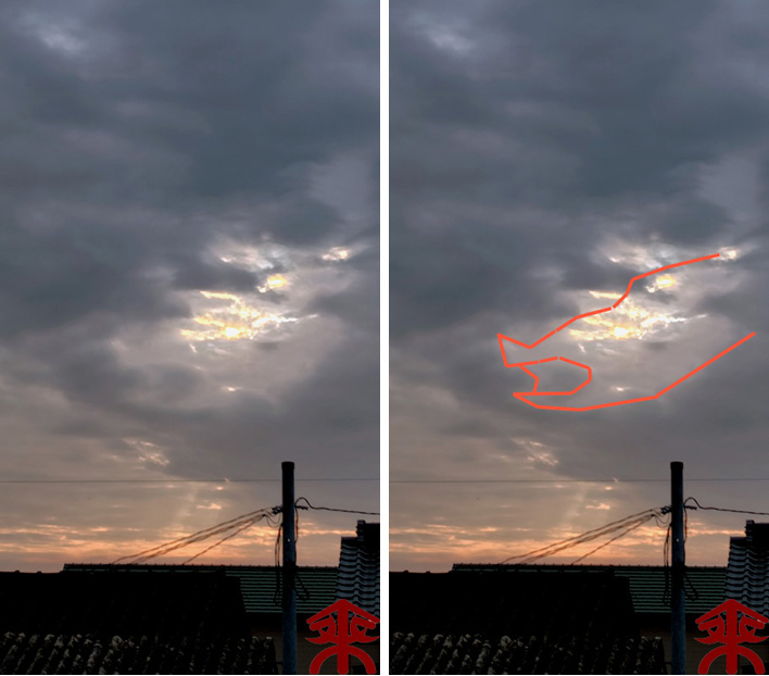 前夜に久し振りの飲み会がありましたので 翌日少し遅めの出勤となりました。 午前8時過ぎに東の空を見ると、龍神様と思しき雲が。 ![]() 少し待てば右のようなお姿になると期待していたのですが 1分後に思わぬお姿で思わず手を合わせました。 ![]() 私にはこのイメージで感じられました。 ![]() 今年もありがとうございました。 |