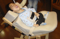 | バギーの修理が完成しました。 座位保持椅子が余りにも居心地がいいので バギーも「あぐら」になれるようにしたよ! |