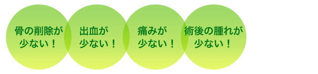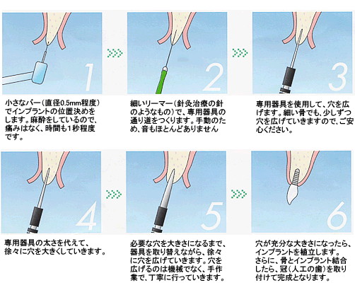 | 従来のドリルを使用してインプラント(人工歯根)を入れる手術は、 骨を削り取るため、骨の幅が狭いとインプラントができない場合や 骨移植などの大掛かりな手術が必要な場合がありました。 OAMインプラント法は、骨表面に小さな穴を開け、専用器具を用い て少しずつ穴を広げてインプラント(人工歯根)を埋入する新しい治 療法です。骨をほとんど削らないため、出血や痛み、術後の腫れも 少なく、体への負担も少なくてすみます。また、術中の不快な音や 振動も少なく、怖がりの患者さんでも安心して治療が受けられる 安心・安全なインプラント手術法です。 |