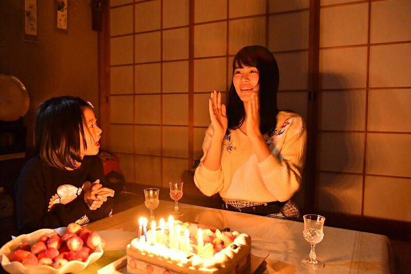 | 食事の後は、ケーキのろうそくを吹き消して、お待ちかねのプレゼントタイム。 |