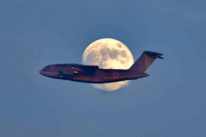 航空自衛隊美保基地のすぐ近くに住んでいるので、よくベランダから飛行機やヘリコプターの写真を撮っているのですが、この日はちょうどいい具合に満月が上りつつあったときに、航空自衛隊の最新鋭の国産輸送機C2がタッチアンドゴーの訓練飛行をしていたのです。