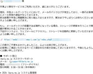 | あなたのメールアカウントがブロックされようとしています ibara.ne.jp | |