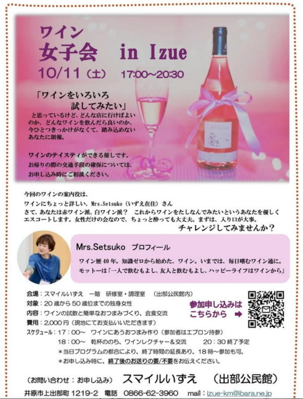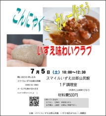 7月5日に「いずえ味わいクラブ」 地元の味を楽しみながら、心もおなかもほっこりしませんか? 日時:7月5日(土) 10:00〜12:30 場所:スマイルいずえ出部公民館 1F調理室(井原市上出部町1219-2) 材料費:500円 持ち物: ・エプロン ・三角巾 ・手拭きタオル ・お子様は上履き&水筒もお忘れなく! 親子での参加も大歓迎! 身近な食材を使って、美味しく・楽しく・学べるひとときをご一緒に♪ お申し込み・お問い合わせ:スマイルいずえ出部公民館 メール:izue-km@ibara.ne.jp 電話:0866-62-3960 主催:スマイルいずえ出部公民館/いずえ地区まちおこし協議会 |