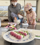 3月30日、出部地区民生児童委員とスマイルいずえの企画による「おやつクラブ」が、スマイルいずえの調理室で開催されました。この日、参加者は春休み中の子どもたちと一緒に、心温まる「お花見だんご」を作り、笑顔あふれる時間を過ごしました。 まず、だんご粉、砂糖、水を混ぜ合わせて滑らかな生地を作りました。生地を3等分し、1つにはピーナッツパウダー、もう1つには抹茶を練り込んで、3色のおだんごに仕上げました。その後、棒状に伸ばして8等分し、丸めて形を整えます。そして、鍋に沸かしたお湯で茹で、浮き上がってきたら冷水に取って冷まします。最後に、色とりどりのおだんごをつまようじに刺して、可愛らしい串だんごを完成させました。お好みで顔を描いてデコレーションすれば、さらに楽しいひと工夫に! |
